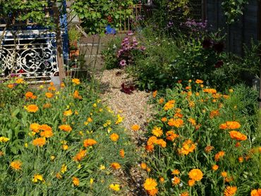 A hidden dining area at the end of the garden, flowers all back in the ground and doing well. Lots of lovely organic vegetables.